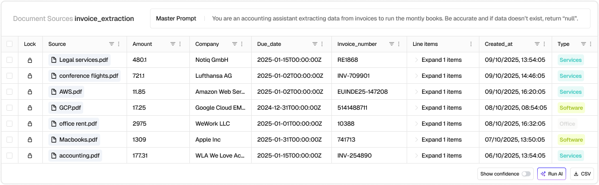 No labeling, machine learning or technical skill required. Simply explain in any language what data you want to extract and the extracted data starts flowing into our table. It doesn't matter if if the files have different formats - just explain what data you need and go from document chaos to quality data in a couple minutes.
